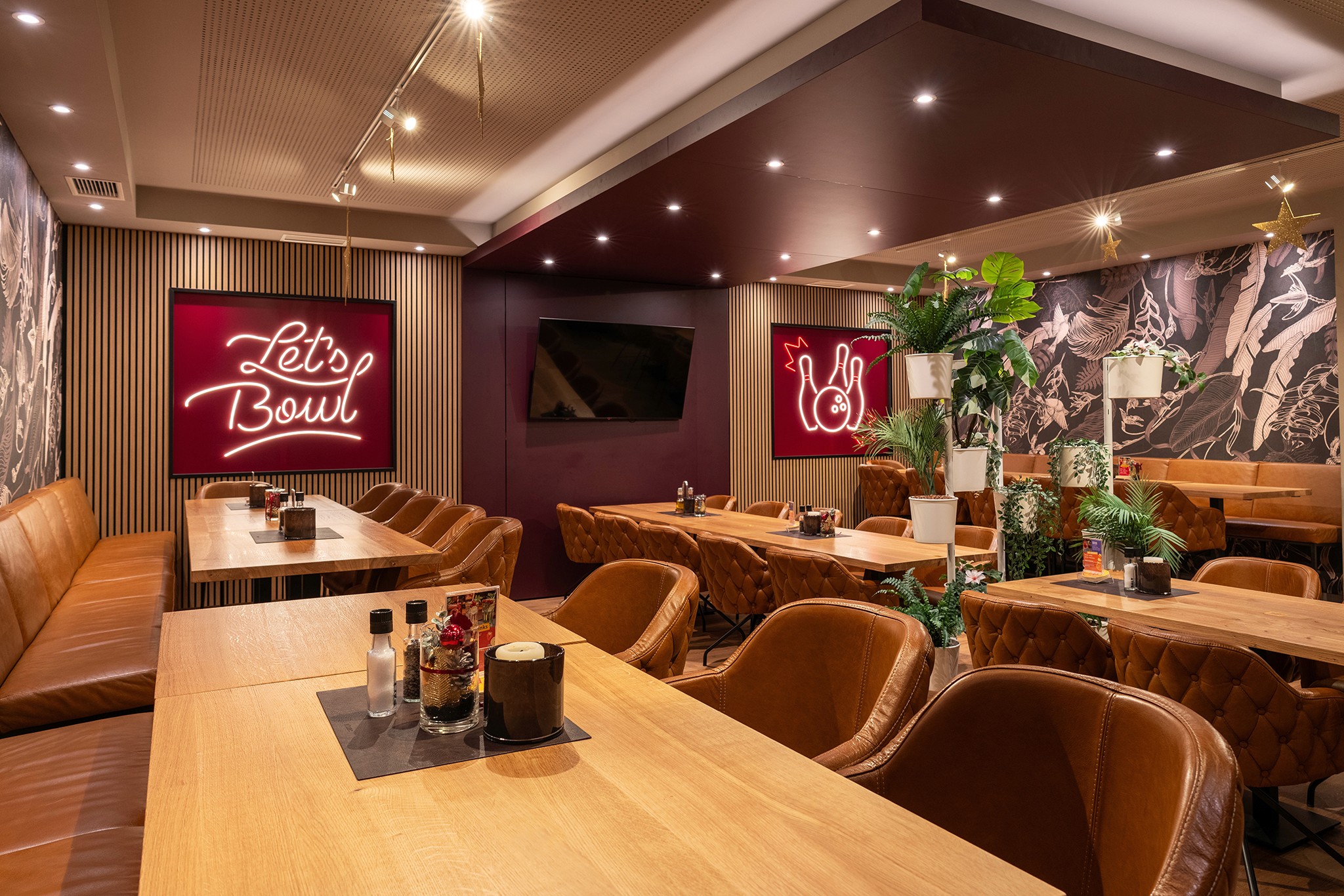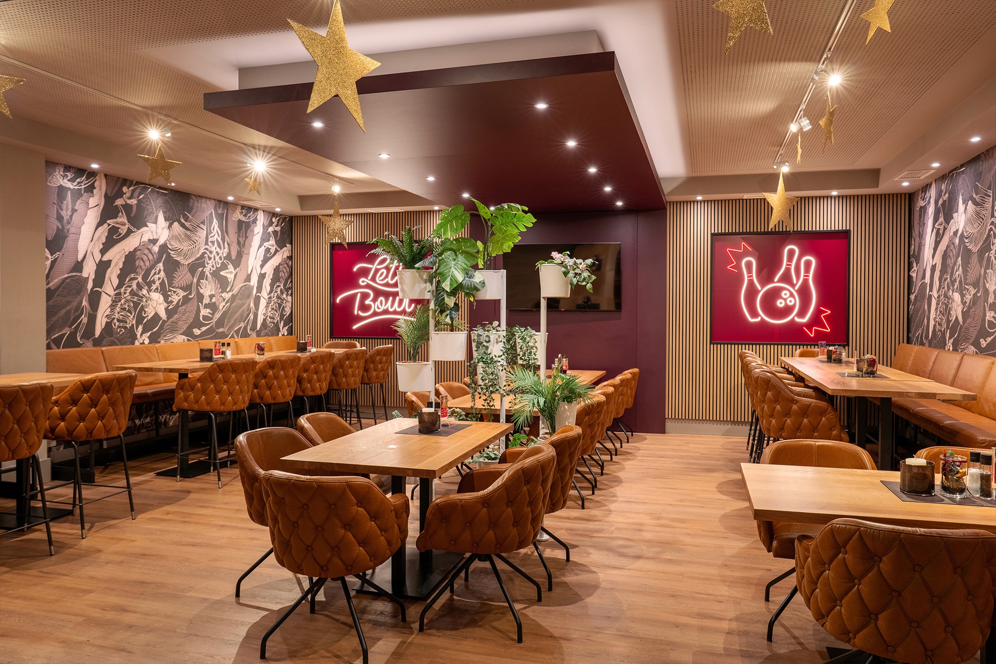 Die Lösung bestand in der Gestaltung eines multifunktionalen Gastraums, der mehr Sitzmöglichkeiten bietet und gleichzeitig flexibel für unterschiedliche Nutzungen eingesetzt werden kann. Ein Gestaltungskonzept mit lebendigen Tapeten, markanten Neonschriftzügen und bequemen Lederstühlen mit hohem Sitzkomfort schafft eine moderne Atmosphäre, die zum längeren Verweilen einlädt.
