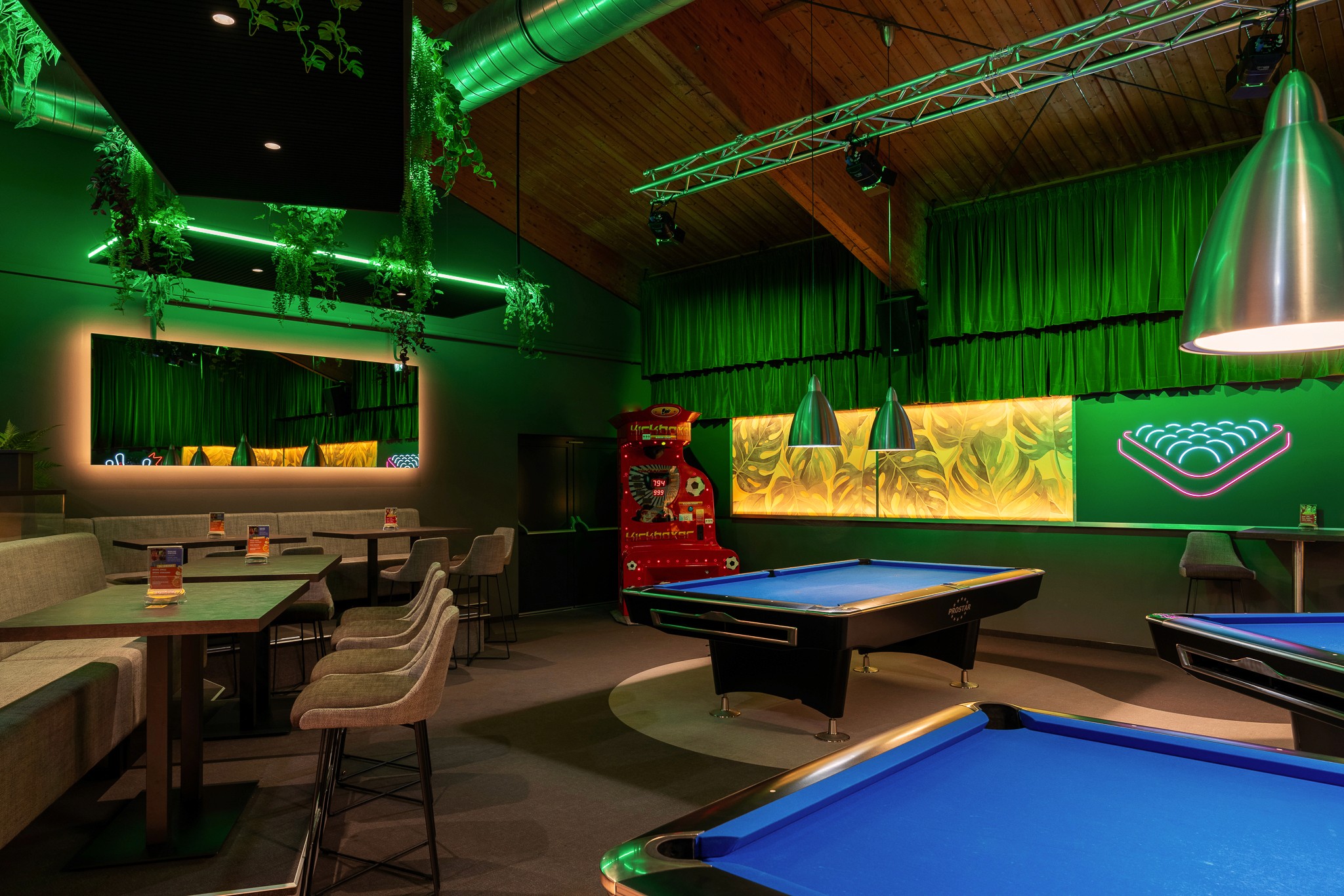 Besonders markant ist die Linienführung am Boden, die den Blick direkt auf die Billardtische lenkt und die Spielflächen optisch in den Mittelpunkt rückt. Durch gezielte Maßnahmen wie abgehängte Akustikfelder und schwere Bühnenvorhänge wird die zuvor störende Geräuschkulisse des großen Raums entschärft, während die flexible Lichtlösung den Raum farblich in jedes erdenkliche Ambiente eintauchen lässt.