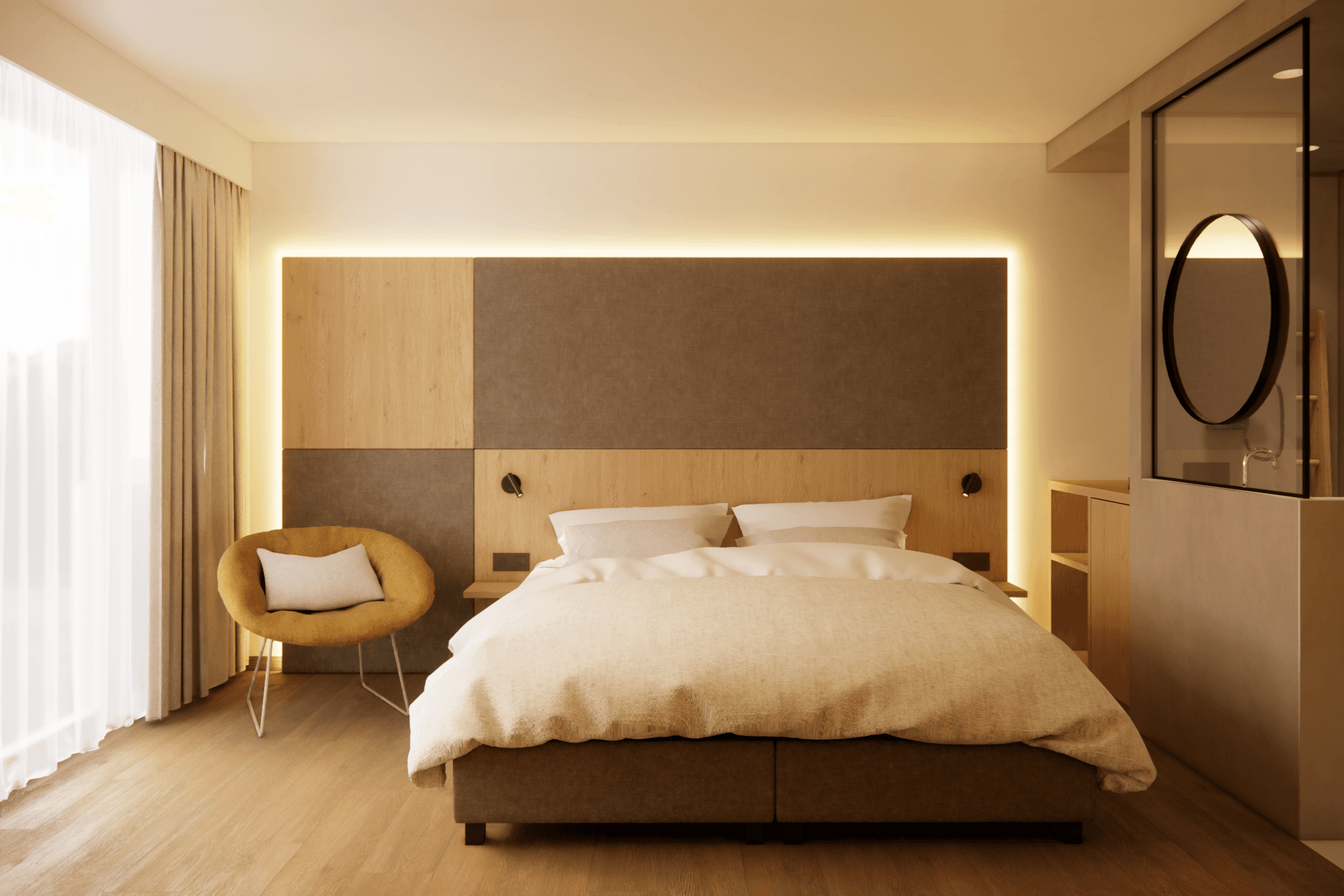 Sanfte Farben, hochwertige Stoffapplikationen und warme Materialien schaffen eine einladende Atmosphäre und einen perfekten Rückzugsort. Durch flexible Raumgestaltung lassen sich die Zimmer optimal an unterschiedliche Gästegruppen anpassen, während große Fenster den Blick auf die umliegende Landschaft öffnen.