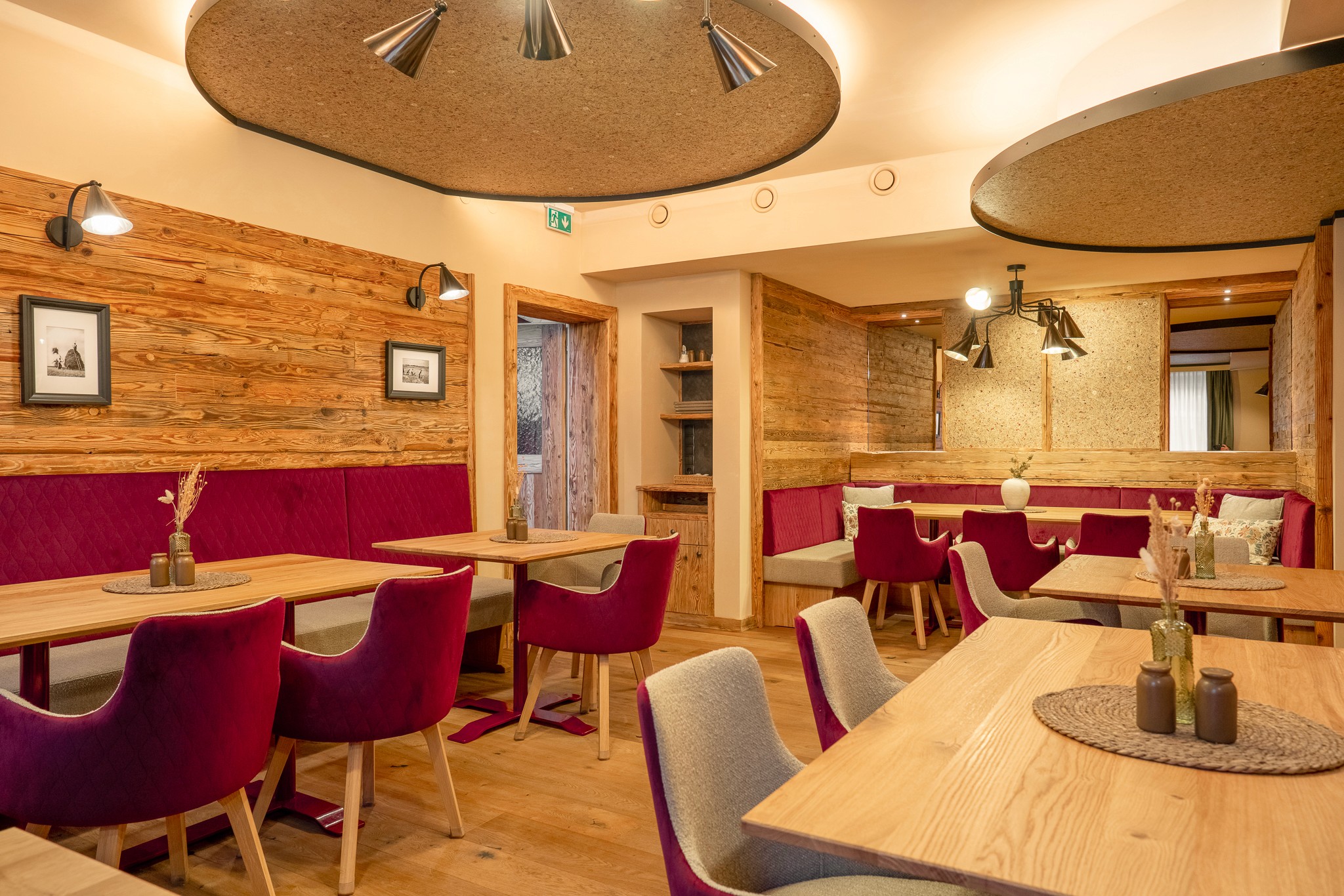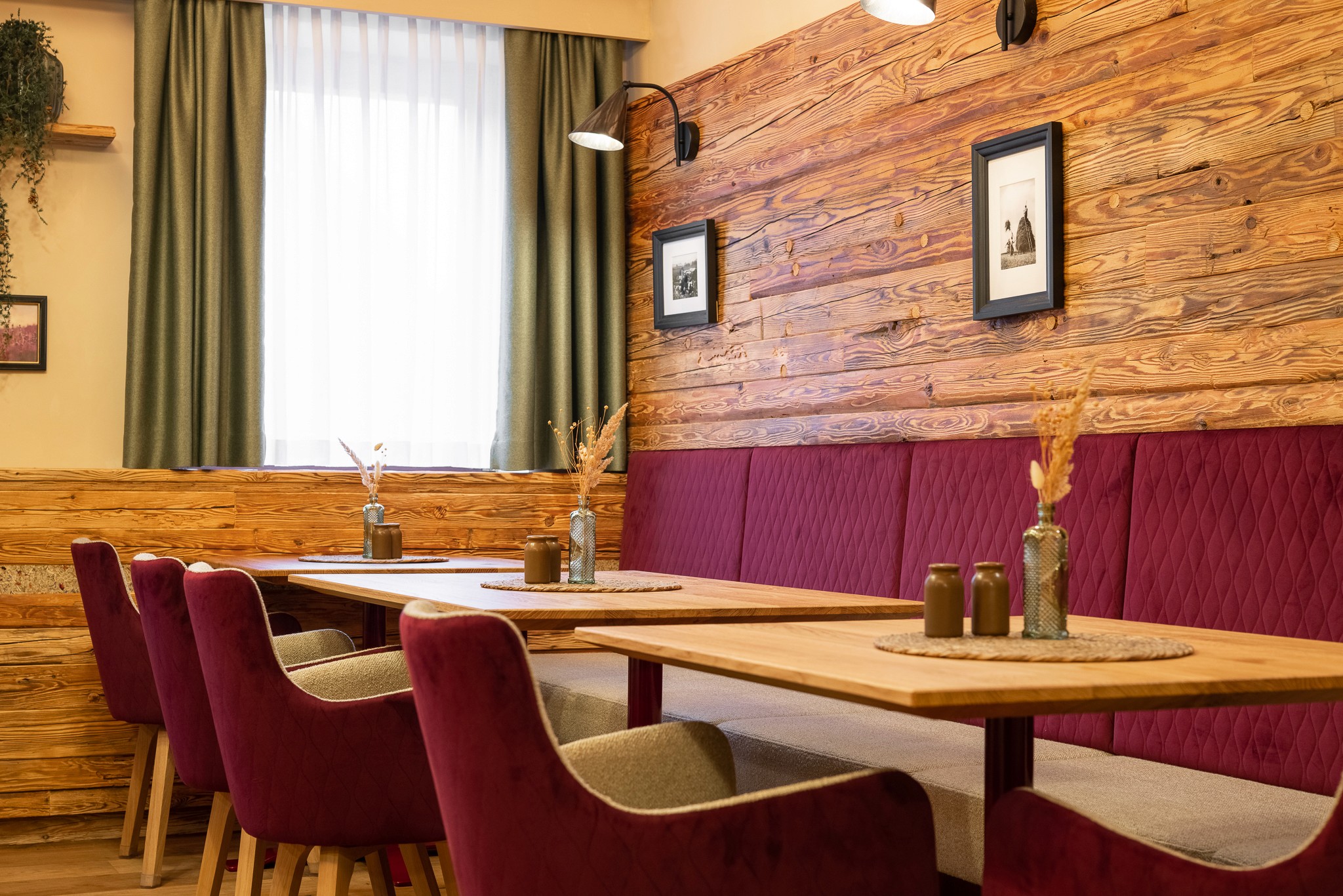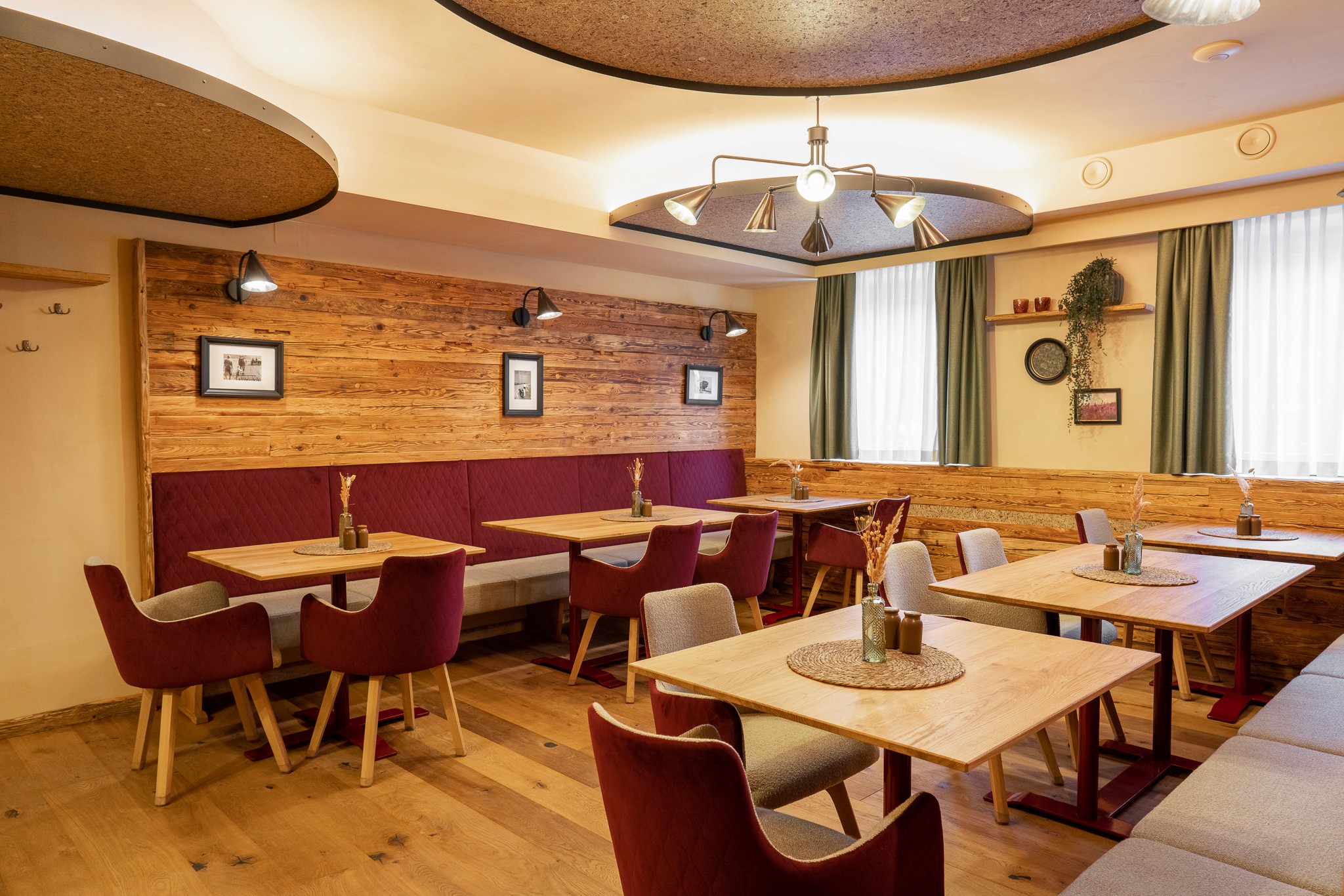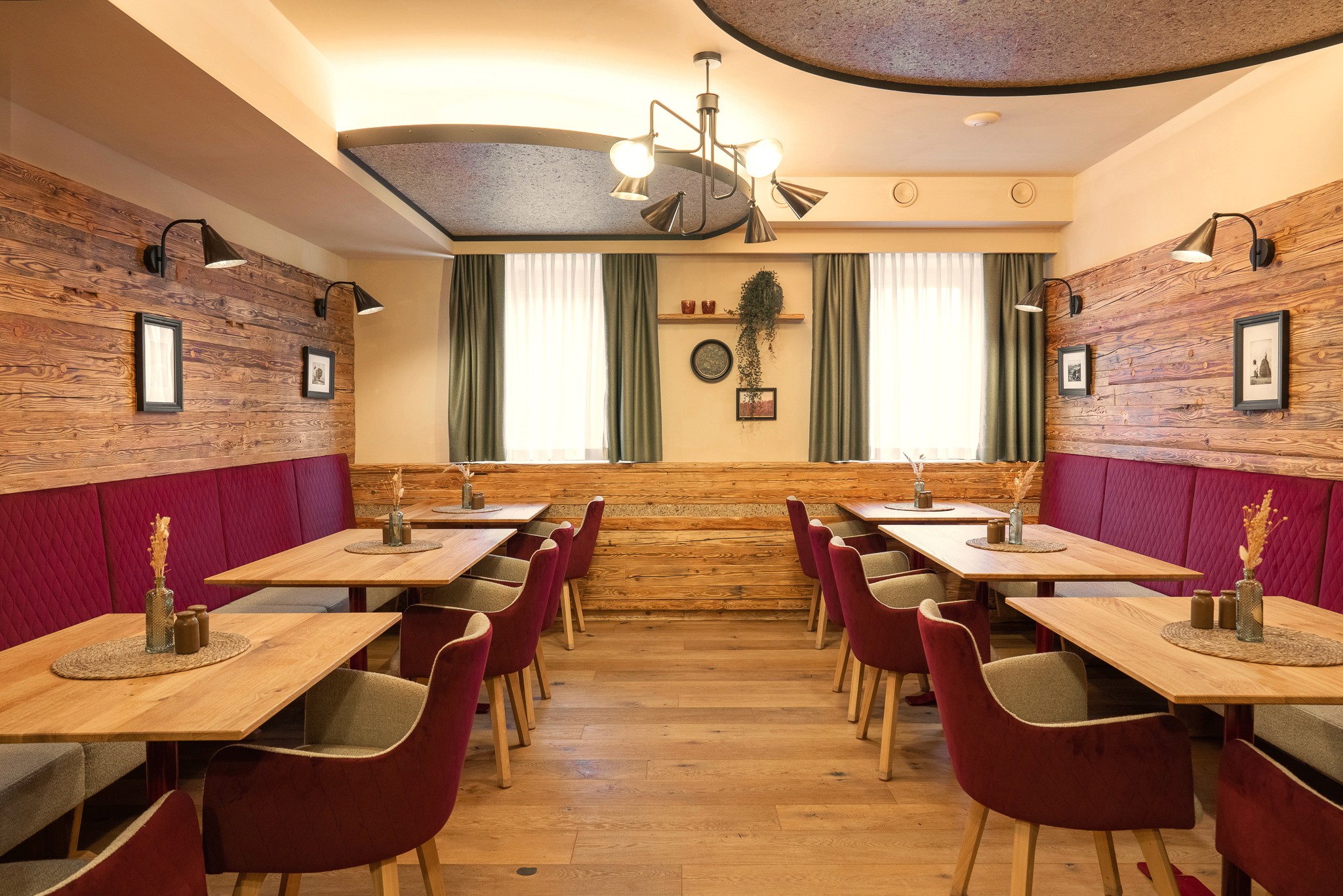 Unsere Aufgabe war, die Funktion der ehemaligen Jägerstube respektvoll zu behandeln, damit sich auch die Stammkundschaft weiterhin wohlfühlen kann. Eine angenehme Raumakustik war ebenfalls ein wichtiges Anliegen des Bauherrn. Außerdem sollte die neue Naturstube keinen wesentlichen Stilbruch zur bestehenden Ausstattung weisen, sondern sie durch ein hochwertiges und naturbelassenes Konzept ergänzen.